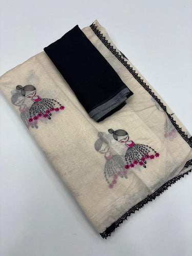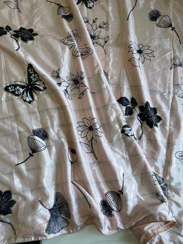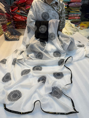 New Chinnon Silk Cream Color Print n Hand Work Fancy Designer Partywear Saree Design