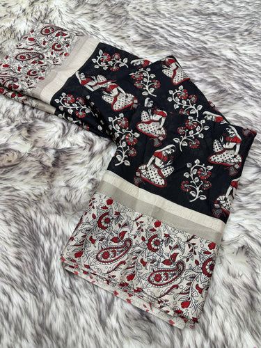 New Kalamkari Print Saree With Sequin & Zari Boder & Tussles in Pallu With Printed Blouse