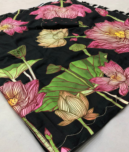 Adorable Festive Wear Black Colour Handloom Tussar Silk With Lotus Floral Digital Print Handwork Fancy Designer Saree With Blouse