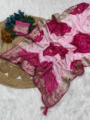 New Festive Wear Shiny Silk Fabric Print With Foil Embroidery Work Fancy Designer Saree With Bandhni Blouse Piece