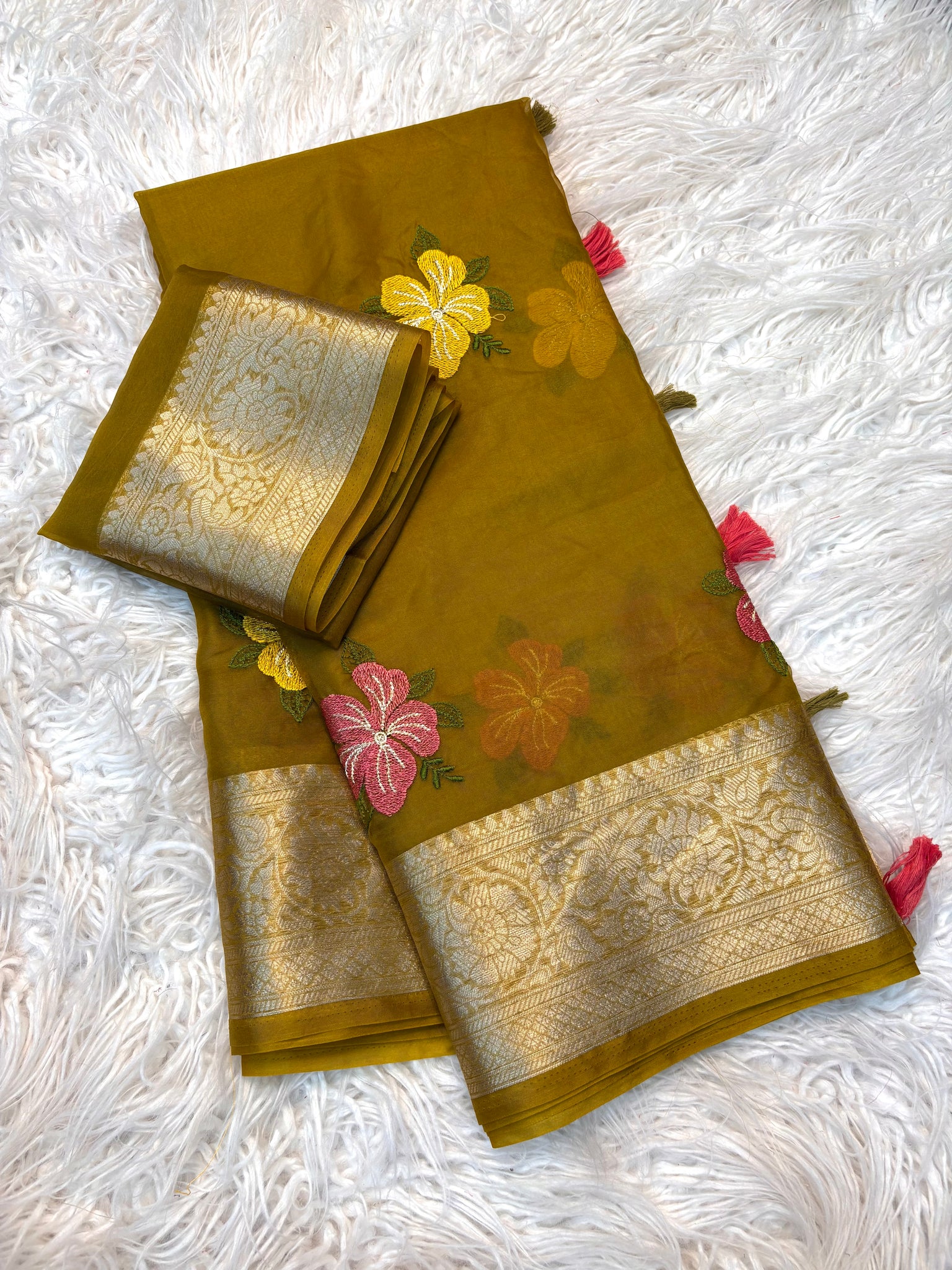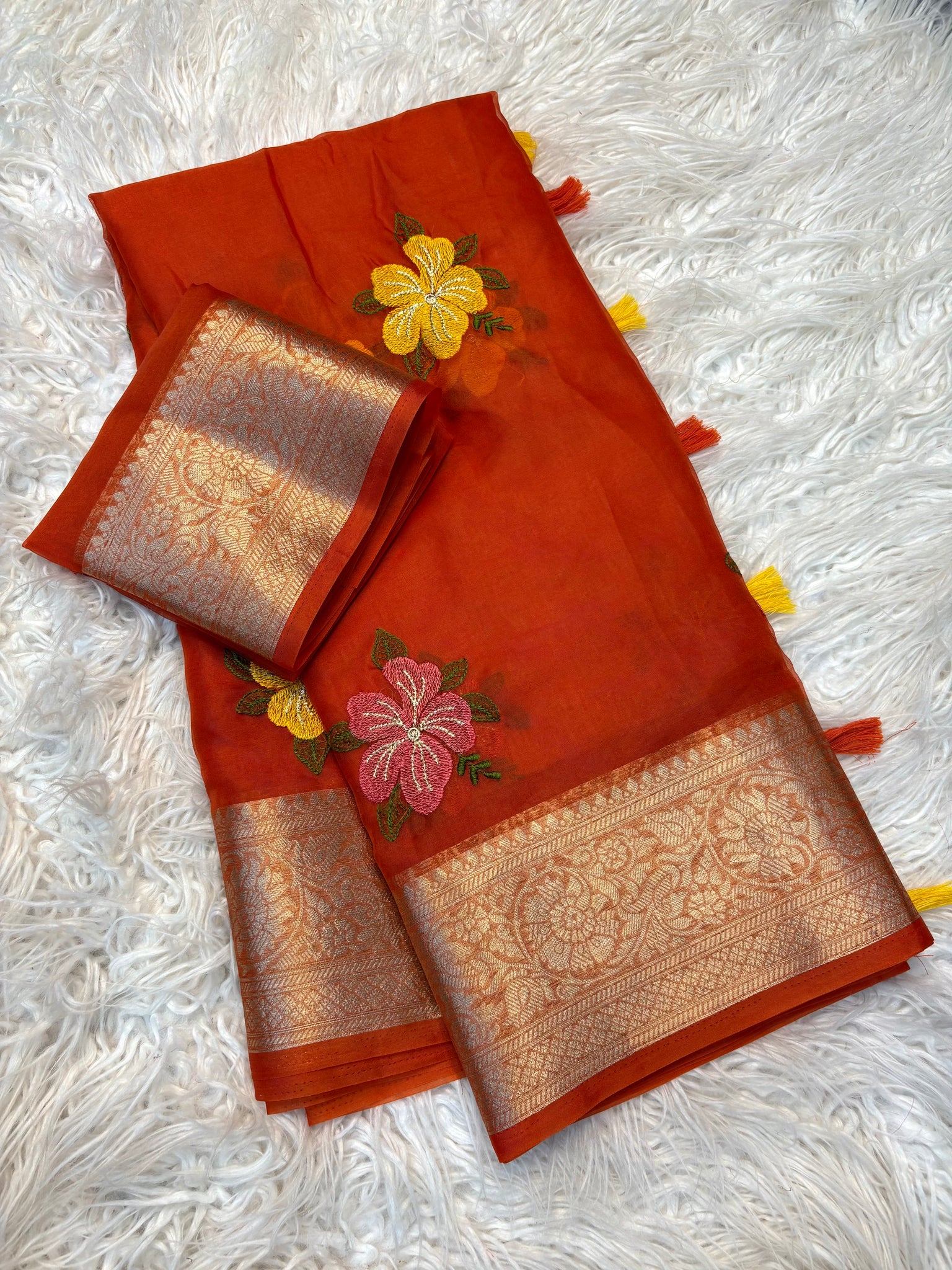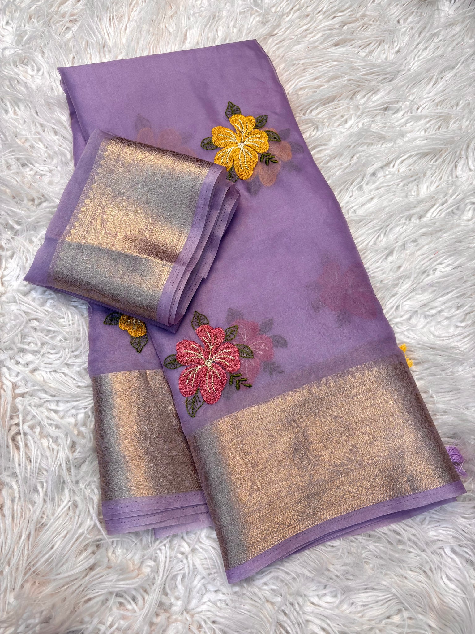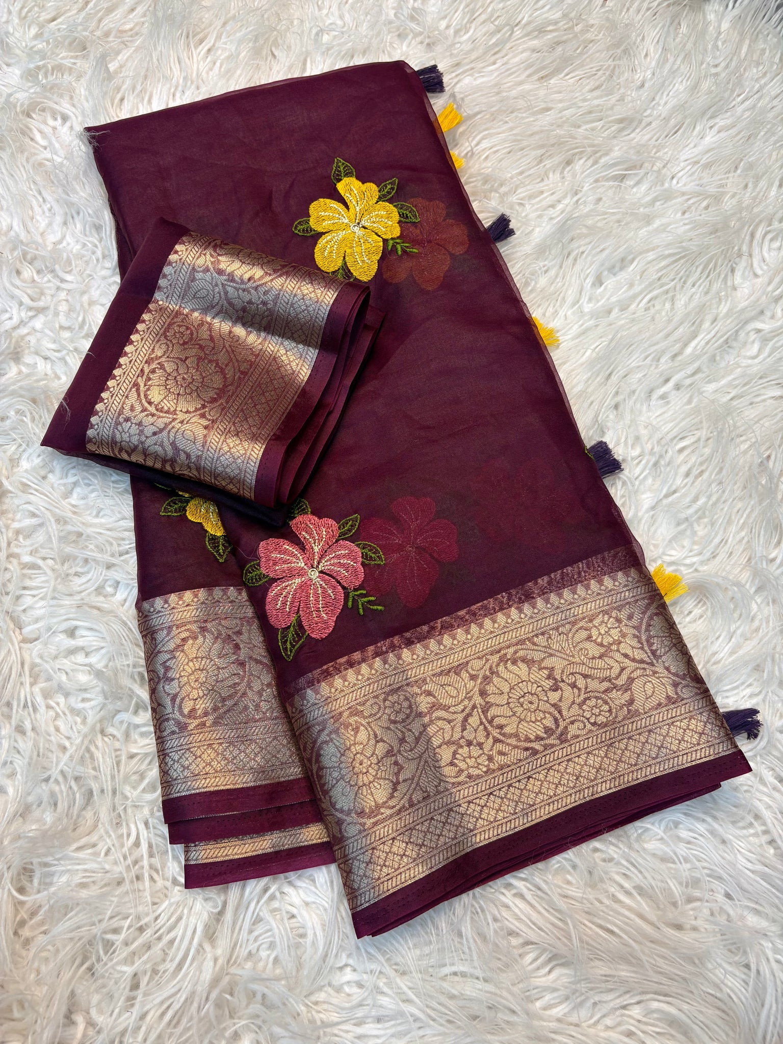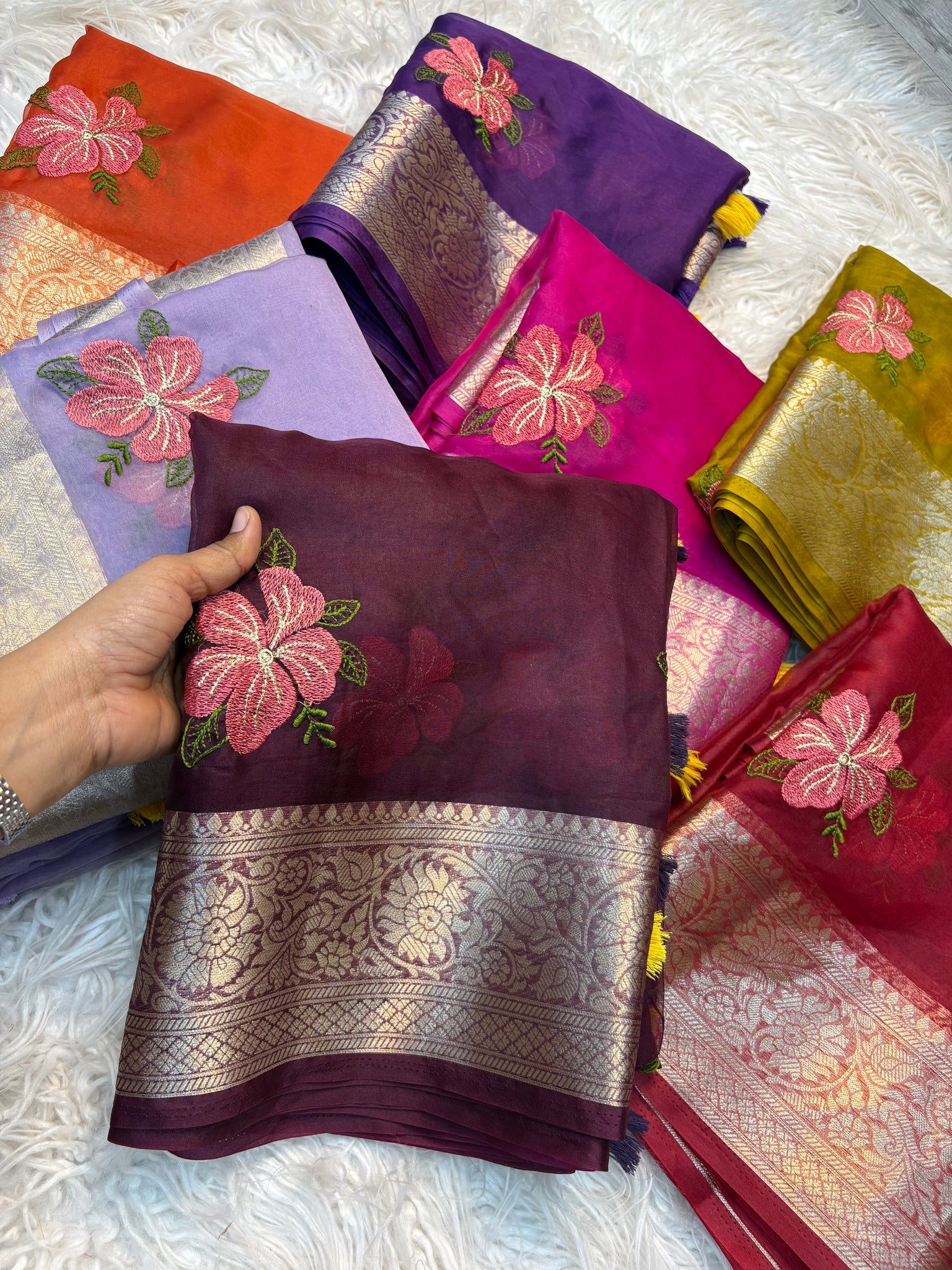 Saree Work : Jacqurad Weaving Border Flower Thread Embroiderey Work