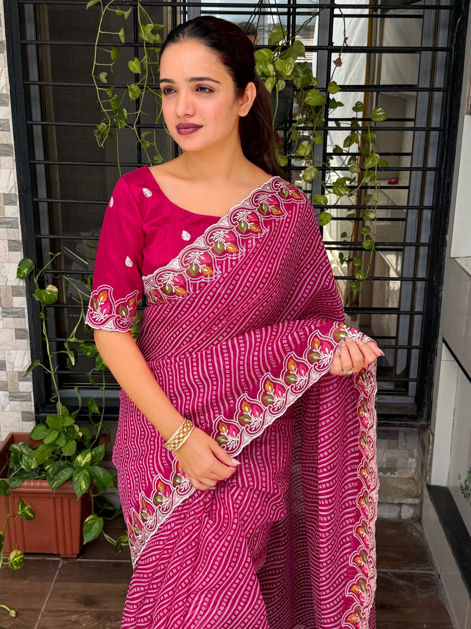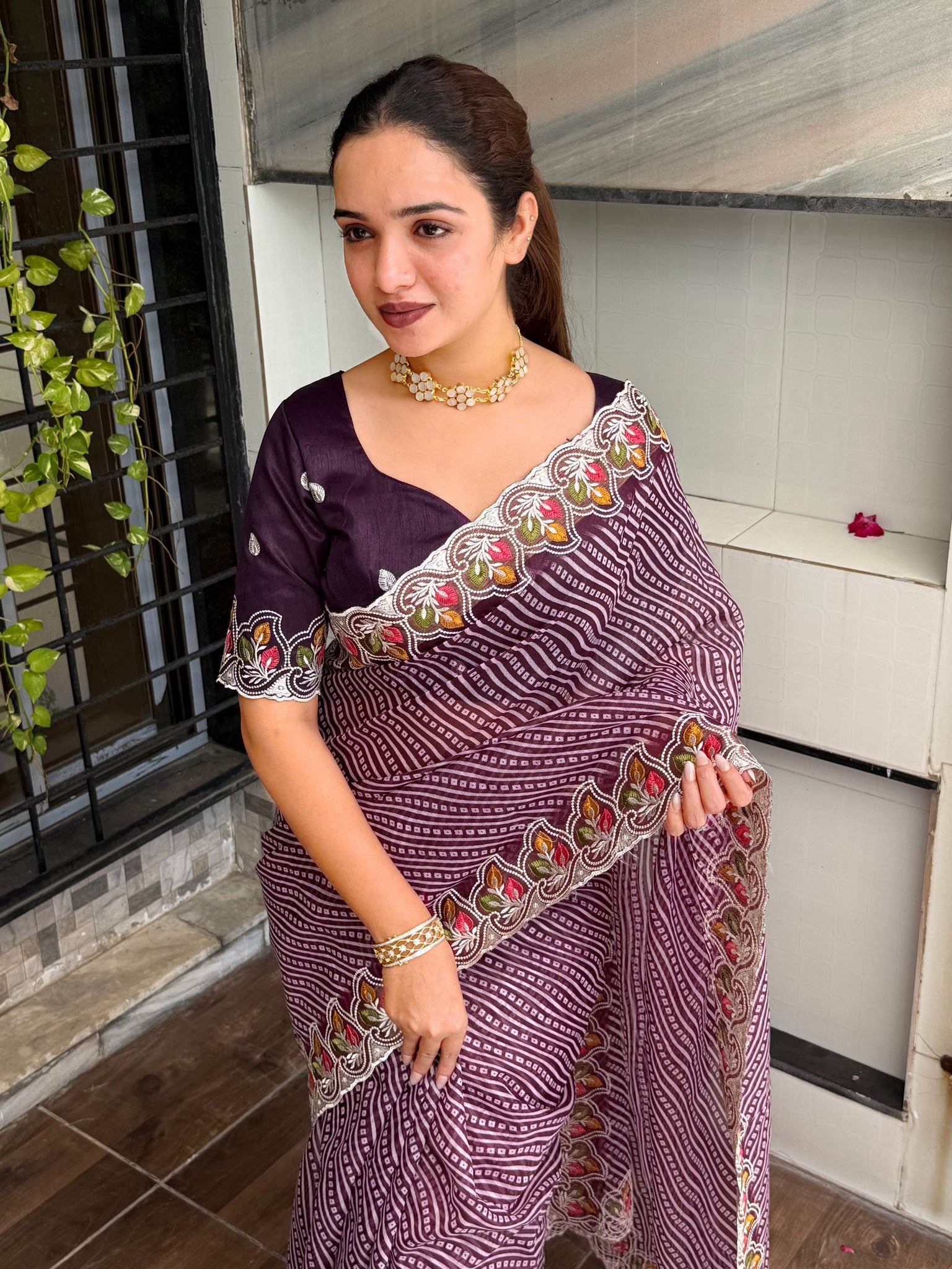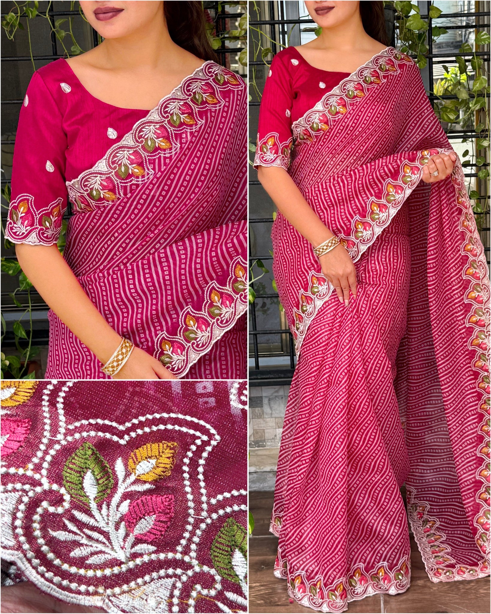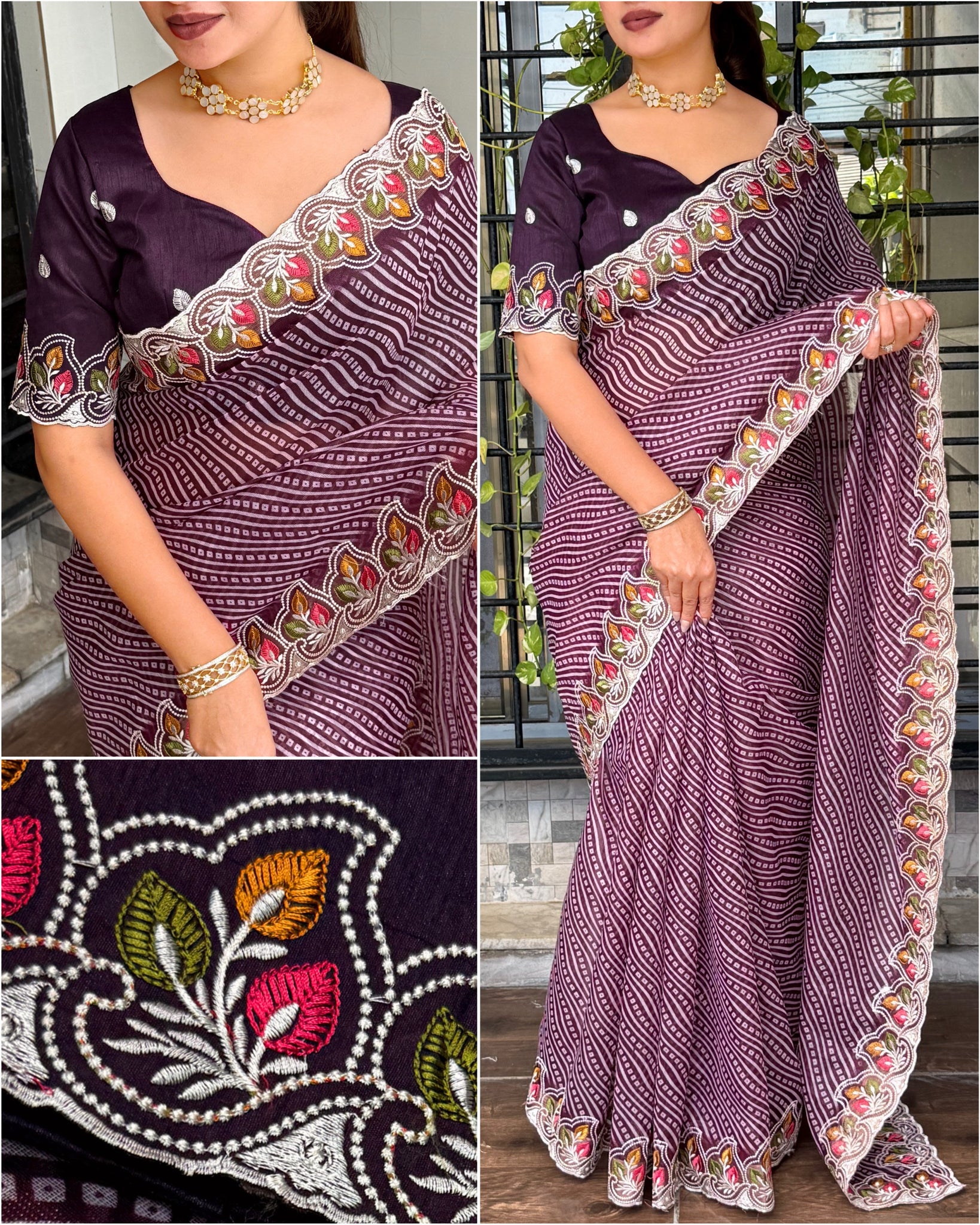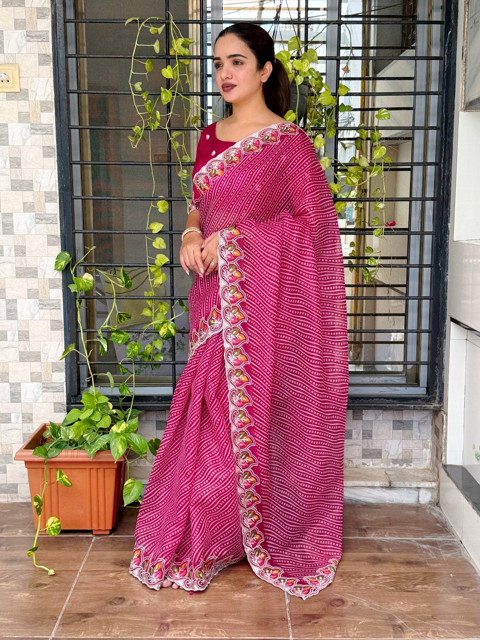 Saree Work : Bandhej Print n Embroidered Work With Zari Border