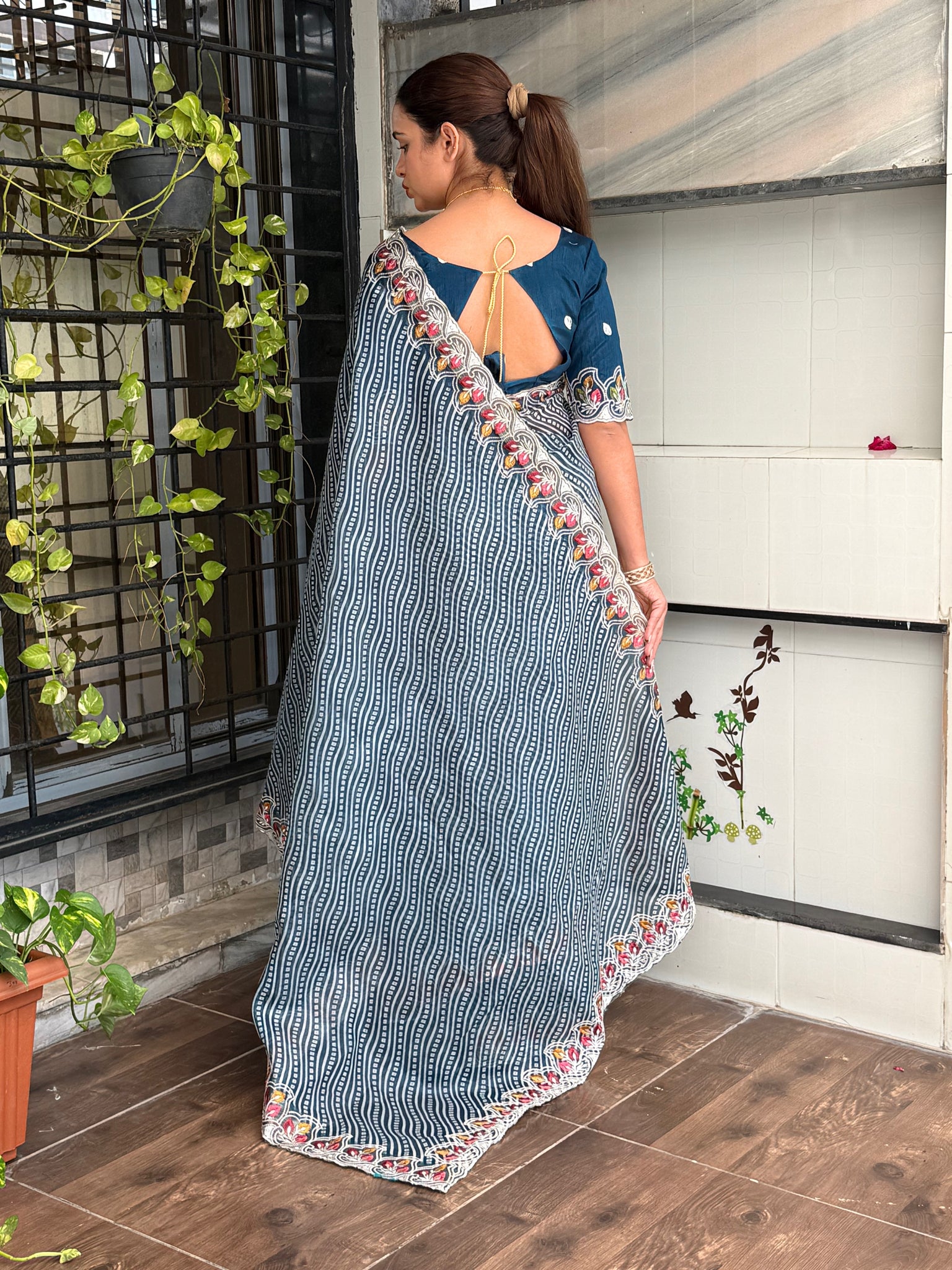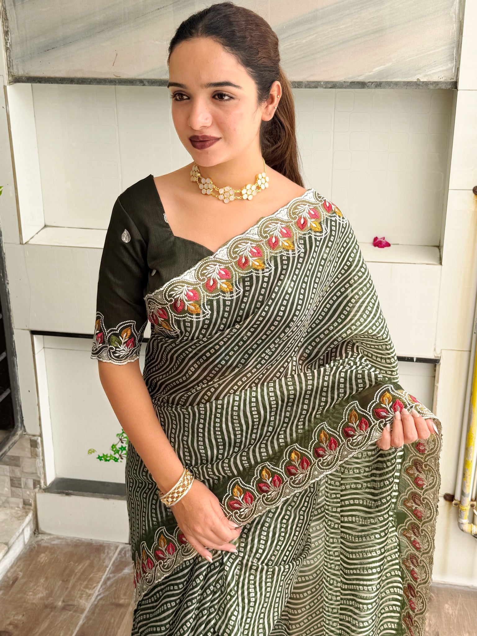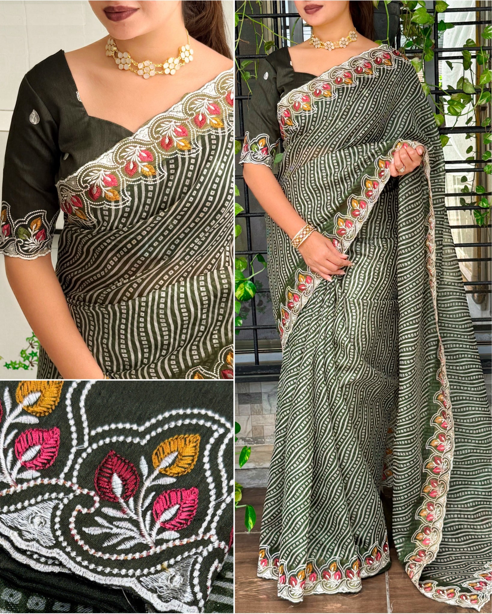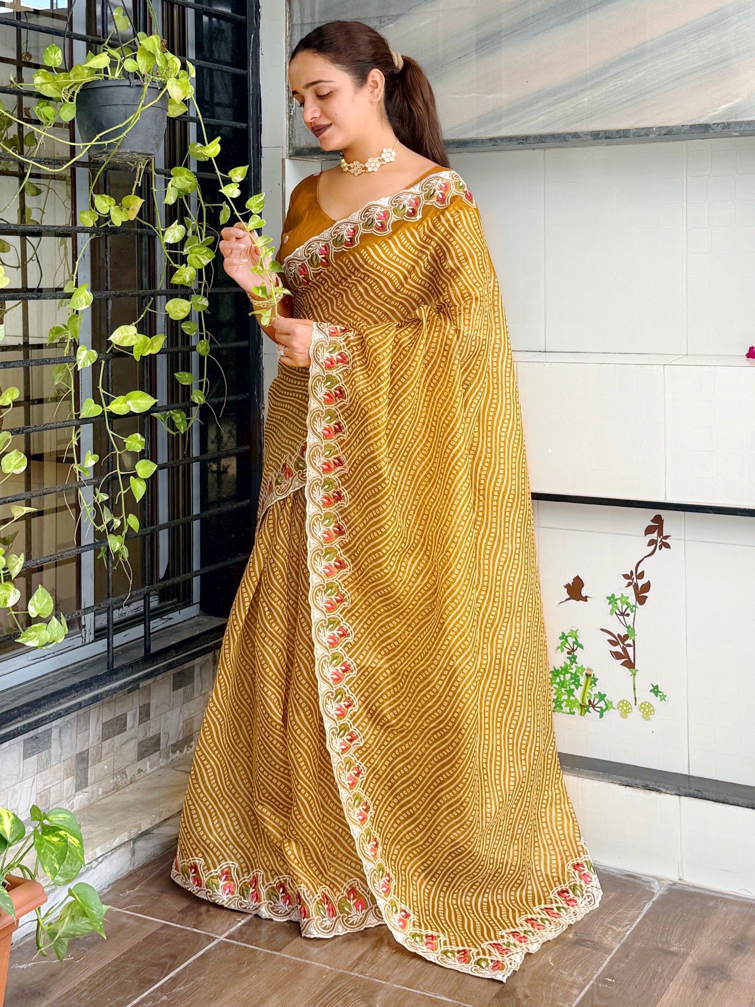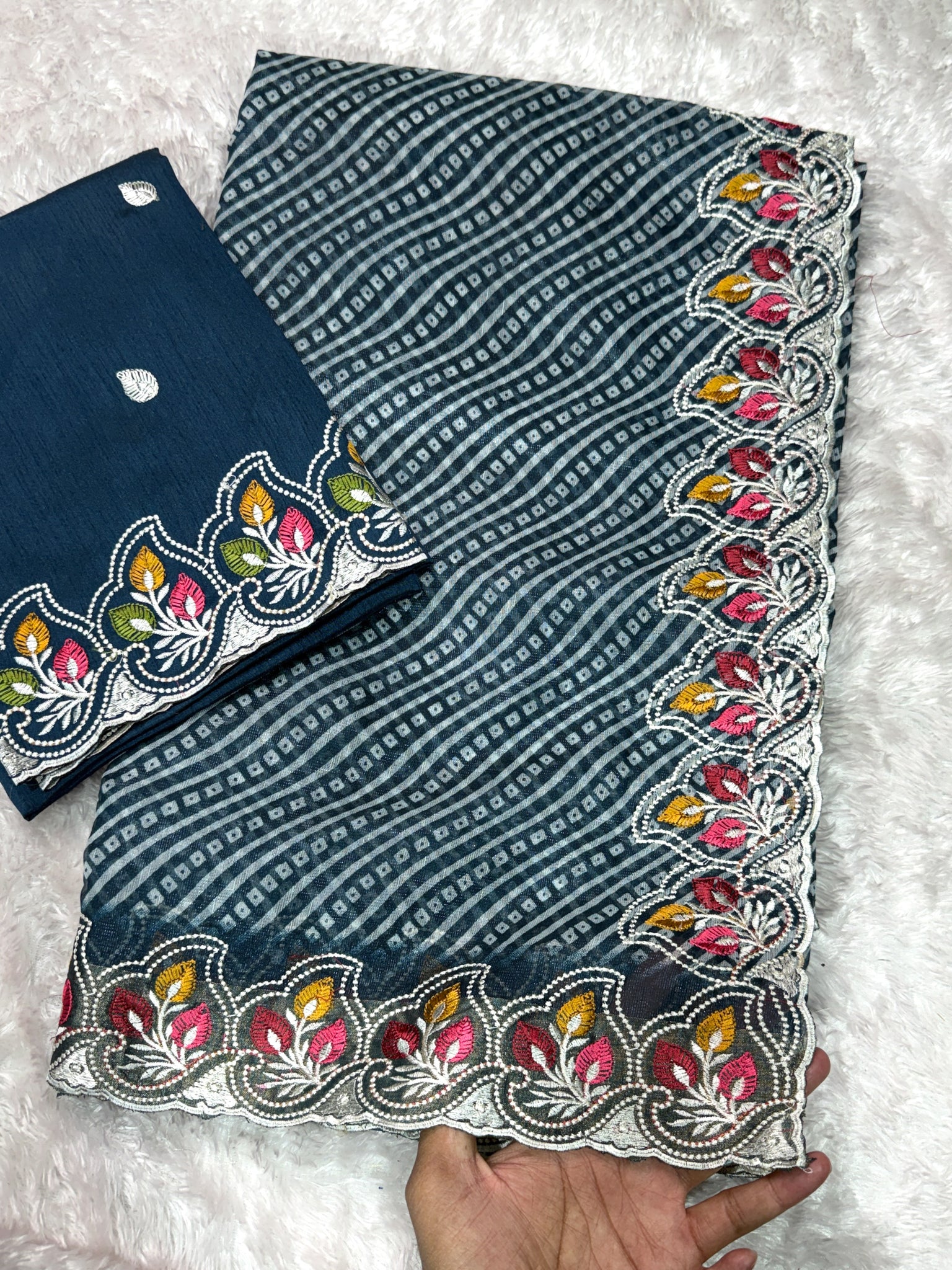 Saree Work : Bandhej Print n Embroidered Work With Zari Border