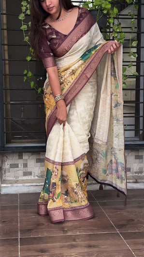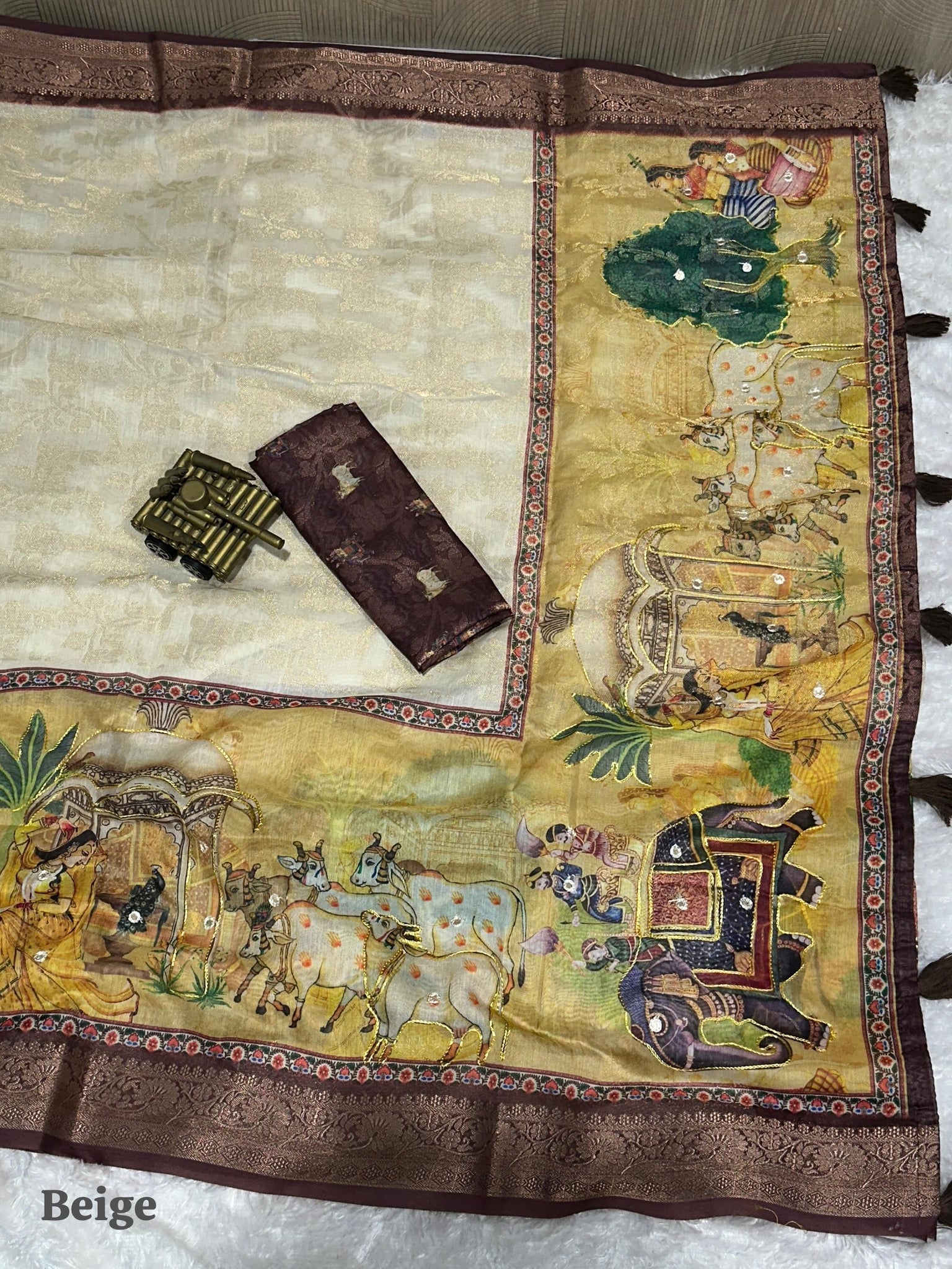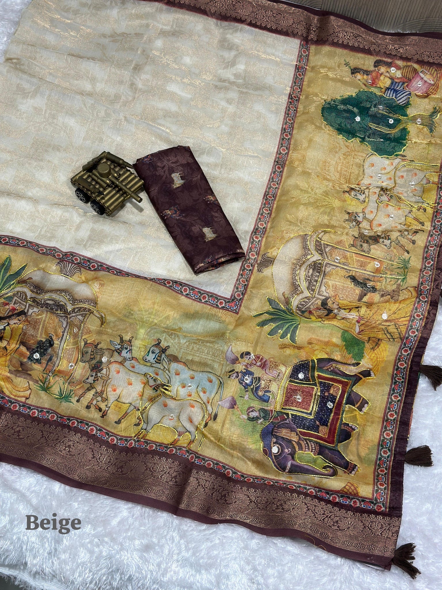 Saree Work : Print With Zari Jacquard With Tussles In Pallu