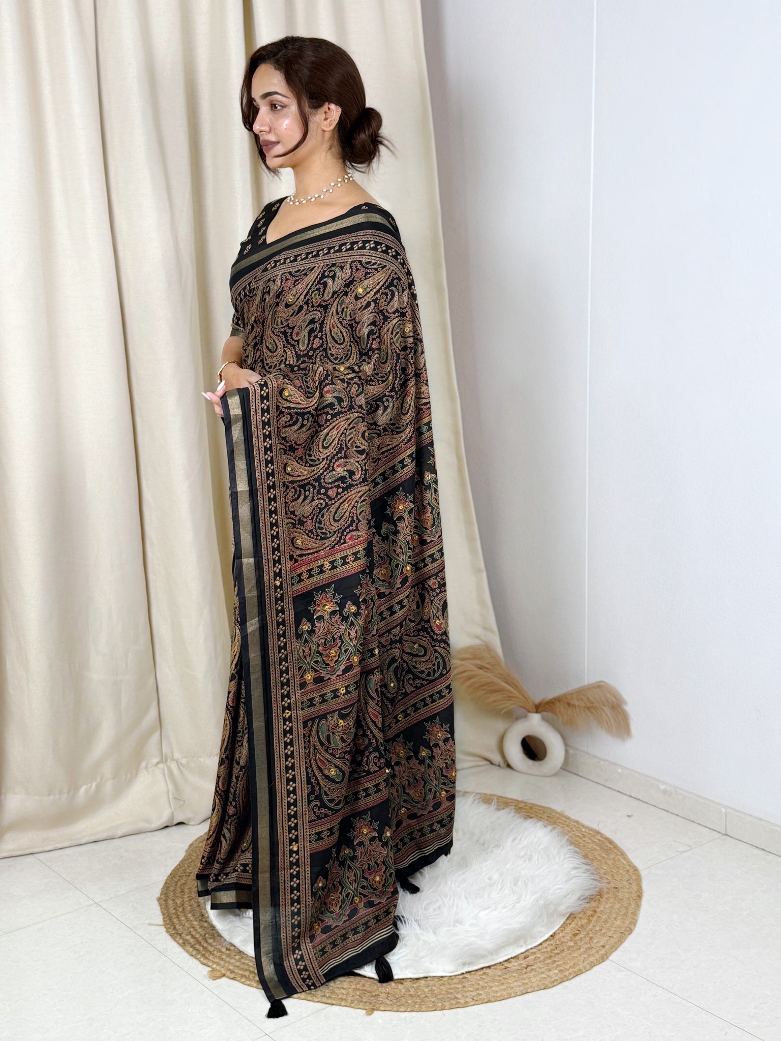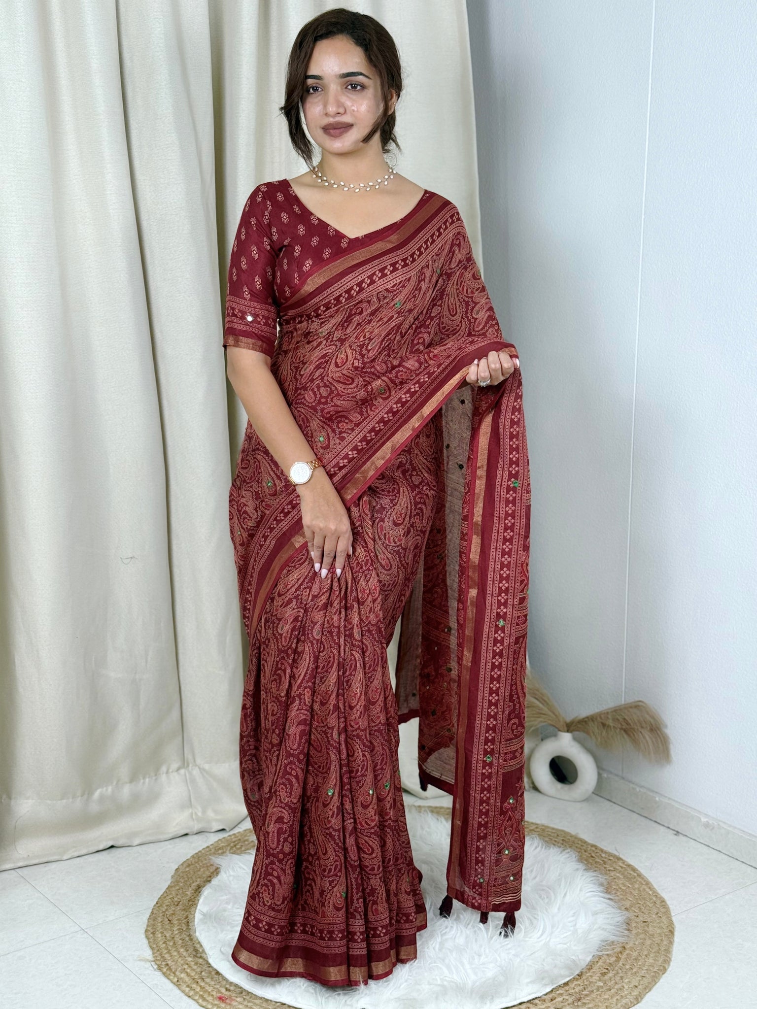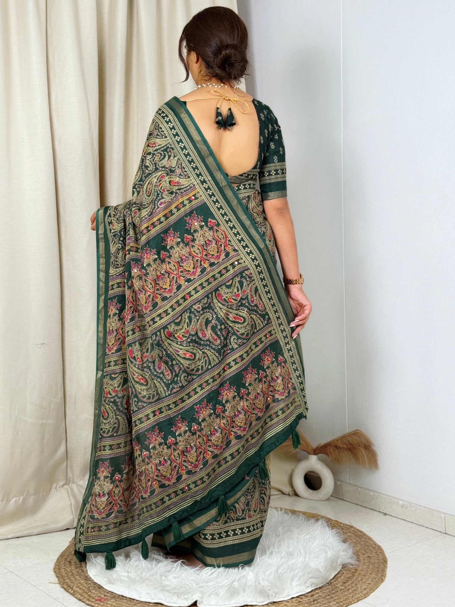 Saree Work : Ajrakh Print n Jacquard Border With Mirror Work